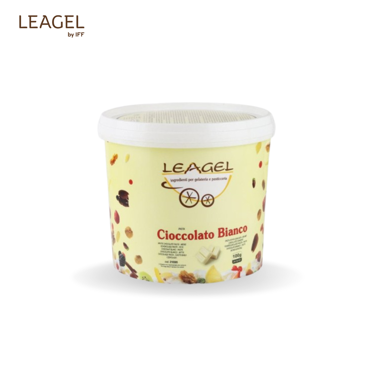 Pastă Ciocolată Albă Pastă cremoasă pentru un gelato cu gust fin de ciocolată albă. Potrivită pentru gelaterie și cofetărie. Dozaj: 80 g / 1 kg bază Cod: 210305 Proces: la rece Ambalare: 3,5 kg