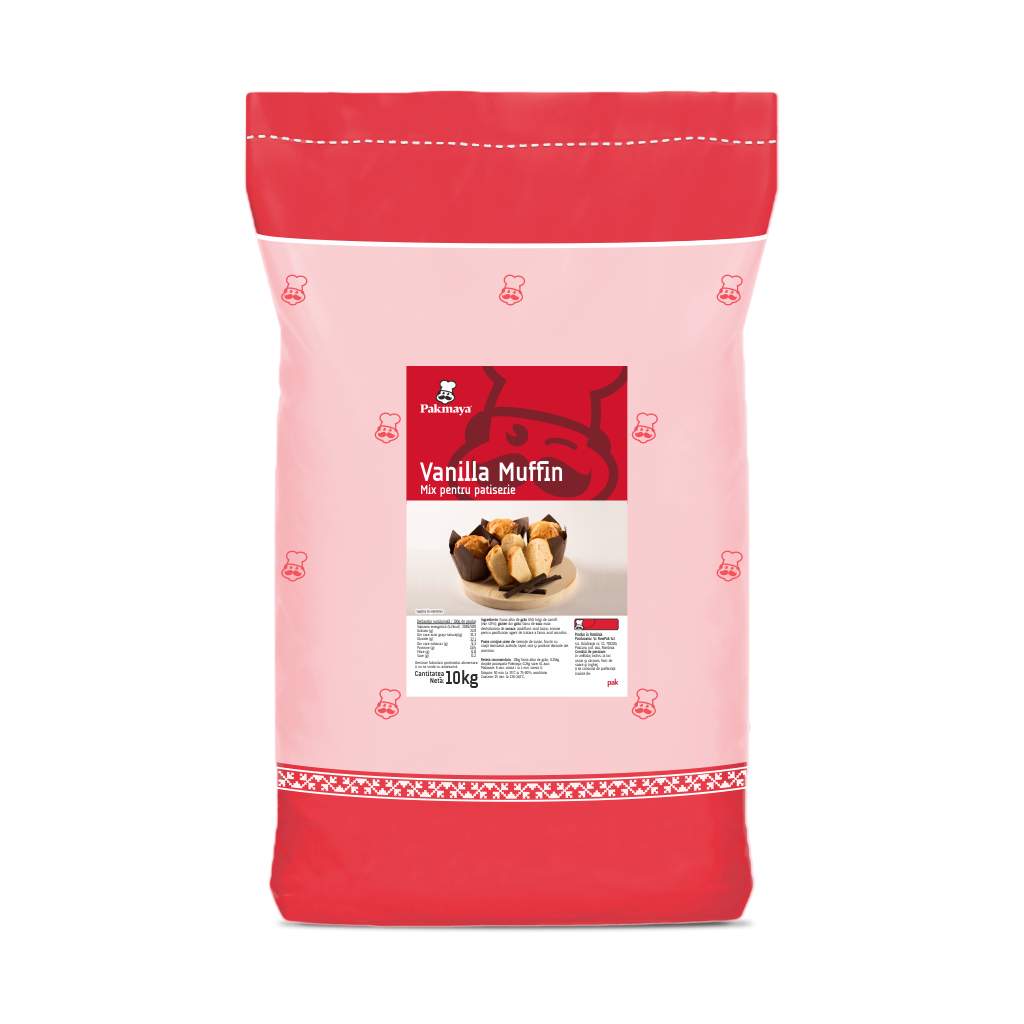 Mix Vanilla Muffin Mix profesional cu ou pudră, ideal pentru brioșe, cupcake-uri, mini checuri și prăjituri simple sau umplute. Asigură miez umed și catifelat, aromă delicată de vanilie și prospețime îndelungată, până la 30 de zile ambalat. Tolerează adaosuri precum fructe sau bucăți de ciocolată și poate fi congelat. Dozaj recomandat: 1 kg mix, 300 ml ulei, 400 ml apă Ambalare: sac 10 kg