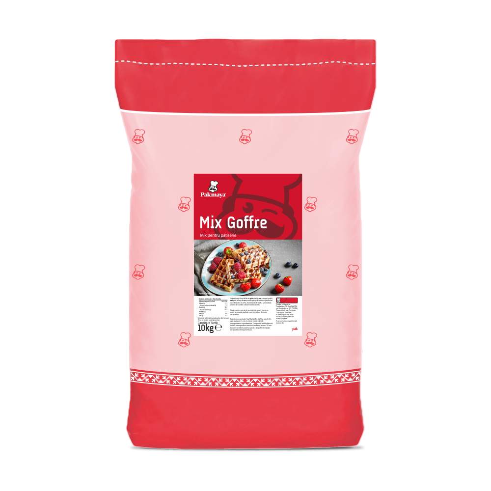 Mix Goffre Mix profesional pentru goffre dulci, waffles, bubble waffles și pancakes. Asigură miez aerat și fraged, crustă ușor crocantă și aromă intensă de vanilie. Conține ou, eliminând necesitatea ouălor proaspete, și este potrivit pentru orice tip de aparat, manual sau industrial. Dozaj recomandat: 1 kg mix, 250 ml ulei, 350 ml apă Ambalare: sac 10 kg