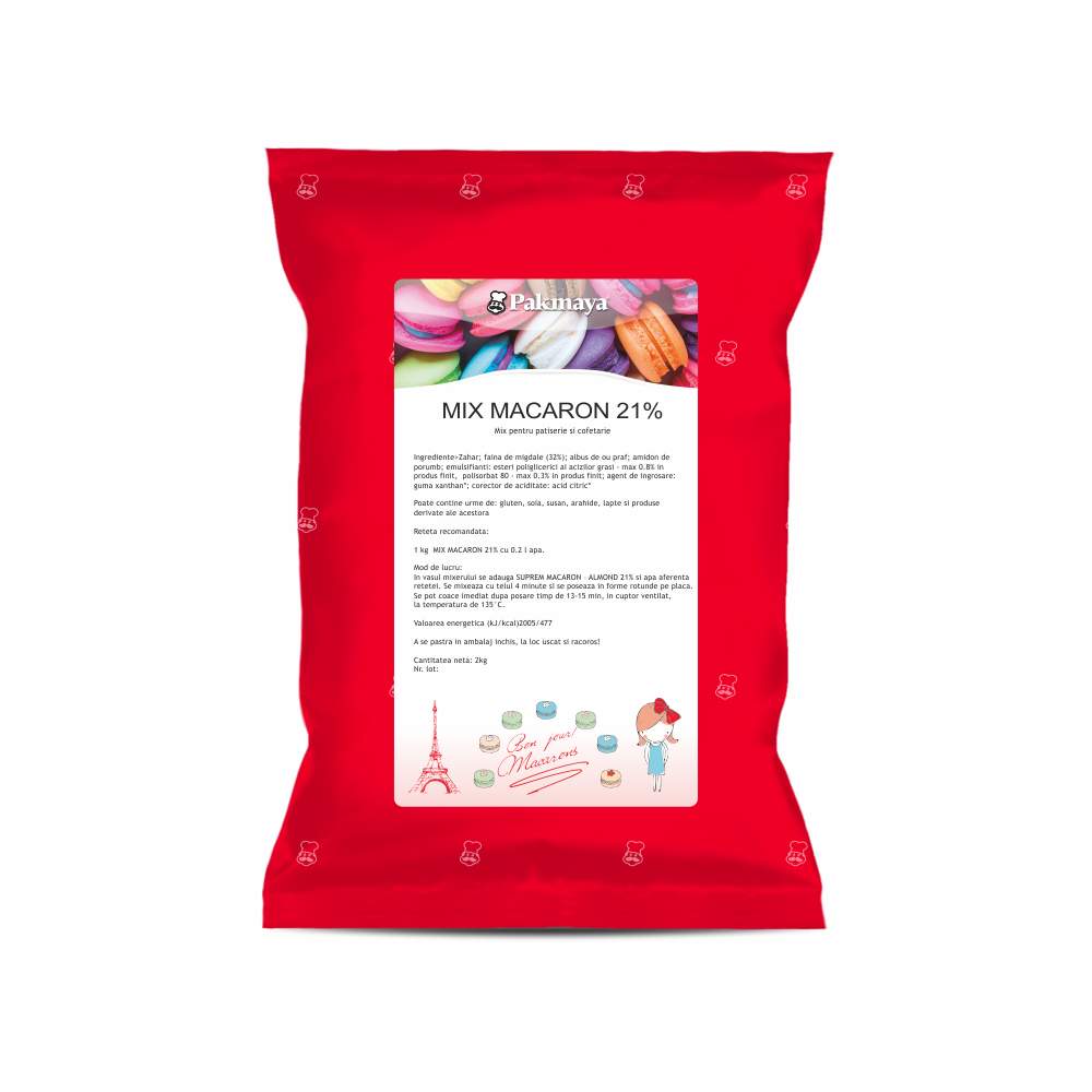Mix Macaron 21% Mix profesional pentru coji de macarons, cu 21% migdale. Asigură exterior crocant, interior aerat și textură uniformă. Ușor de preparat – necesită doar apă la 45°C – și potrivit atât pentru procesare manuală, cât și industrială. Dozaj recomandat: 1 kg mix, 200 ml apă Ambalare: cutie 2 kg
