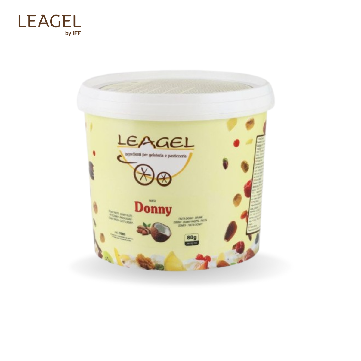 Pastă Donny Pastă cu gust bogat de ciocolată albă, migdale și fulgi de cocos, pentru un gelato cremos și rafinat. Potrivită pentru gelaterie și cofetărie. Dozaj: 80 g / 1 kg bază Cod: 210805 Proces: la rece Ambalare: 3,5 kg