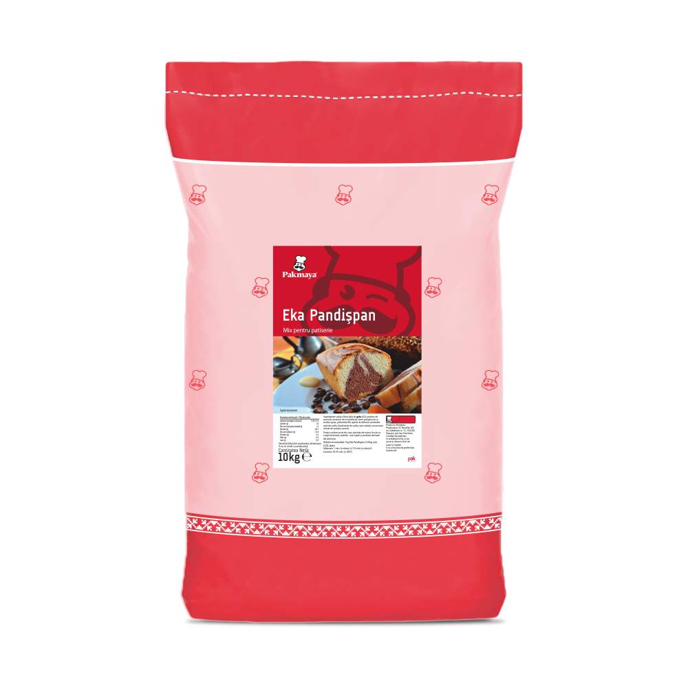 Mix Eka Pandișpan Mix profesional pentru pandișpan, foi de prăjituri și blaturi de tort, cu textură aerată și porozitate fină. Ideal pentru blaturi însiropate, cu retenție ridicată a siropului (până la 100%), volum optim și prospețime constantă. Dozaj recomandat: 1 kg mix, 430 g ou proaspăt, 230 ml lapte Ambalare: sac 10 kg