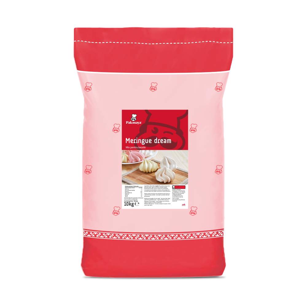 Meringue Dream Mix profesional pentru bezele și decoruri din bezea, cu structură fermă, suprafață netedă și lucioasă și exterior crocant. Ideal pentru bezele clasice sau prăjituri Pavlova. Preparare simplă – necesită doar zahăr și apă la 40–50°C. Dozaj recomandat: 1 kg mix, 1 kg zahăr, 1 litru apă fierbinte Ambalare: sac 10 kg