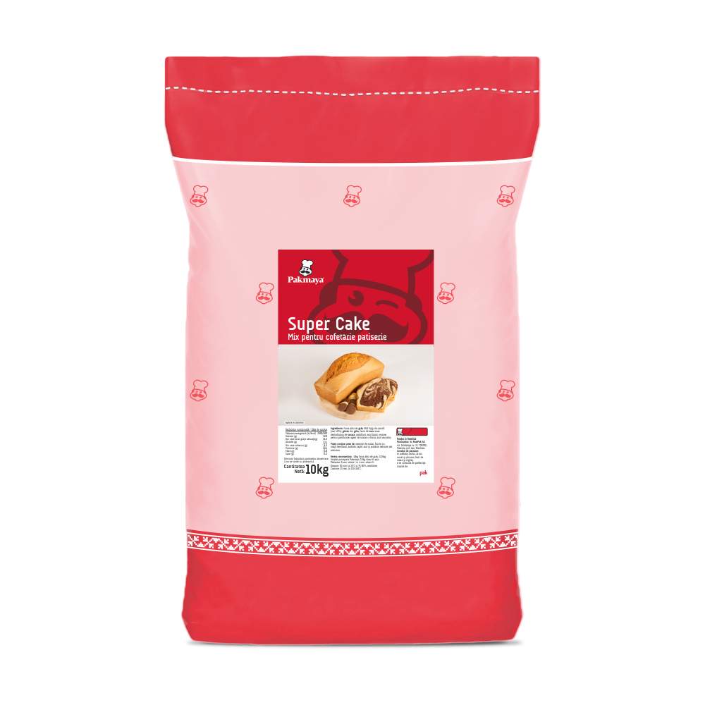 Premix Super Cake Mix profesional pentru checuri, tarte cu fructe și prăjituri cu blat dens și umed. Permite adaosuri variate precum cacao, nuci, ciocolată sau fructe confiate. Oferă miez umed și elastic, gust bogat și prospețime îndelungată. Dozaj recomandat: 100 g mix, 450 g făină, 450 g zahăr, 450 g ou proaspăt, 100 g apă, 250 g ulei Ambalare: sac 10 kg