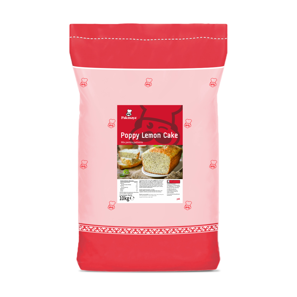 Mix Poppy Lemon Cake Mix profesional pentru prăjituri cu gust de lămâie și mac, cu miez umed și textură uniformă. Versatil și ușor de preparat, poate fi utilizat simplu sau cu umpluturi și decoruri variate. Asigură prospețime îndelungată, până la 30 de zile ambalat. Dozaj recomandat: 1 kg mix, 350 ml apă, 350 ml ulei Ambalare: sac 10 kg