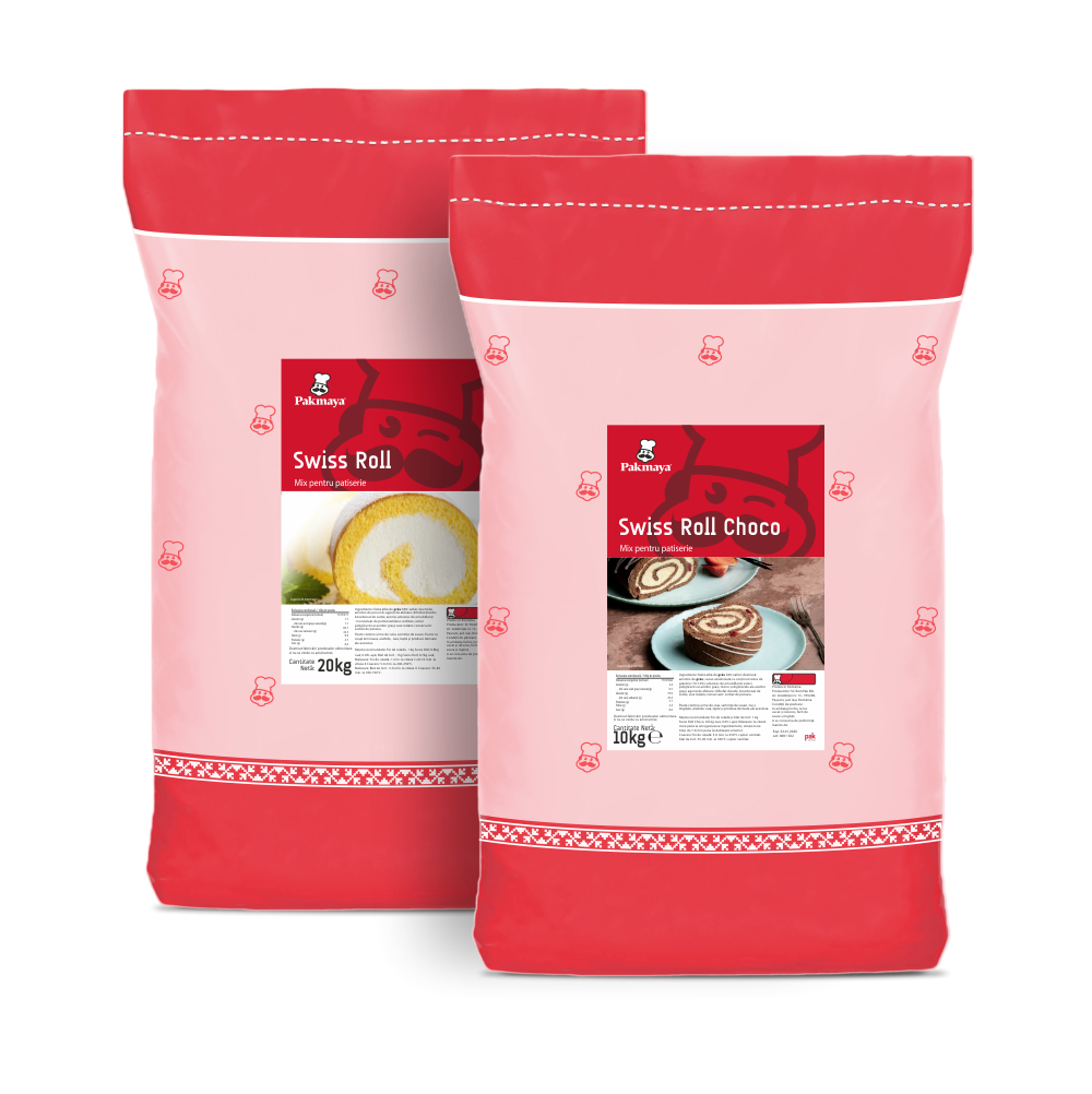 Mix Swiss Roll / Swiss Roll Choco Mix profesional pentru foi de ruladă, blaturi de prăjituri și torturi. Asigură textură aerată, porozitate fină și volum optim, cu flexibilitate ridicată a foilor. Potrivit pentru blaturi însiropate, cu gust intens de vanilie sau cacao și prospețime de până la 30 de zile. Dozaj recomandat: 1 kg mix, 800 g ou proaspăt, 50 ml apă Ambalare: sac 20 kg